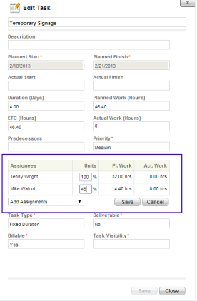 Note: Changing a team member's assignment for a task can impact the task itself. For example, if a task is effort driven, one day in duration and has one resource assigned at 100%, then the assignment is changed to 50%, the task duration will change to 2 days.