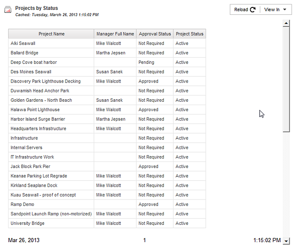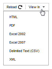Reload refreshes the display. View In provides options to select available output types for viewing. Some output types may not be available if the report is cached and the output type was not selected.