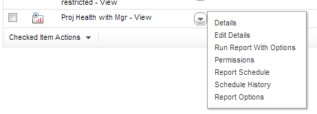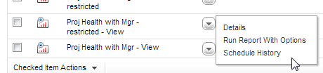 The consumer or author can view the report view details, run the report with options, and view the schedule history.