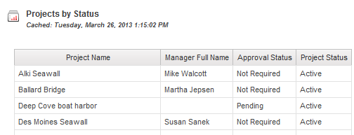 View a cached report by clicking the report name or including the report in a dashboard. For more information, see Viewing Cached Report Output.